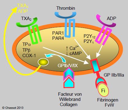 Figure 8.13: The different categories of antiplatelet agents, classified according to the receptor blocked. Inhib: inhibitors. IPDE: phospho-diesterase inhibitor. vWF: von Willebrand factor. Fi: fibrinogen.