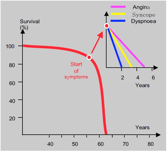 Figure 11.110: In aortic stenosis, the onset of symptoms significantly alters the prognosis: life expectancy is only 5 years after the onset of angina, 3 years after the onset of syncope and less than 2 years after the onset of dyspnoea [4].