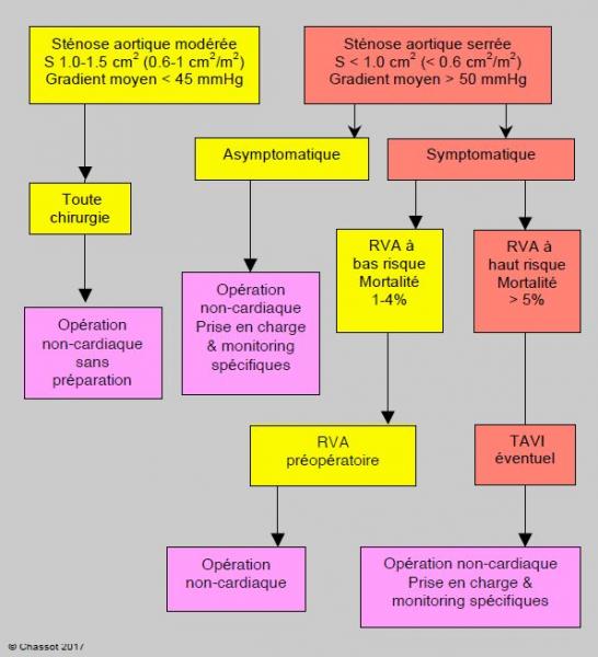 Avec les progrès de la prise en charge anesthésique basée sur un contrôle hémodynamique rigoureux, les dernières études comparatives entre porteurs de sténose aortique serrée et malades sans sténose tendent à montrer que les résultats de la chirurgie non-cardiaque sans RVA préalable sont acceptables, même si le risque est plus élevé [1,36]. Les porteurs de sténose serrée ont davantage de complications cardiaques (18.8% versus 10.5%), surtout liée à la décompensation ventriculaire, mais la mortalité à 30 jours est peu modifiée par rapport aux contrôles: patients symptomatiques 5.9% versus 3.1%, patients asymptomatiques 3.3% versus 2.7% [36]. Ces valeurs sont superposables à celles de la chirurgie à risque élevé et à risque intermédiaire dans la population générale. Du fait de ces bons résultats, il est proposé de restreindre le RVA aux malades symptomatiques. La chirurgie non-cardiaque intermédiaire et majeure peut être conduite sans danger excessif chez les porteurs de sténose aortique serrée asymptomatiques. Si la mortalité prévisible du RVA est supérieure à 5%, il peut être préférable de procéder directement à la chirurgie non-cardiaque, selon son risque, en prenant soin de conduire l'anesthésie sous monitorage invasif et contrôle strict de l'équilibre hémodynamique. Le TAVI (implantation valvulaire aortique sur cathétérisme par voie trans-apicale ou trans-fémorale) présente lui-même un risque opératoire de 5-8% (Figure 3.9B) [32,35].