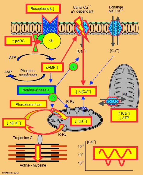 La concentration myocardique des récepteurs β1 baisse de moitié. La compensation est une augmentation du taux de récpeteurs β2 (chronotropes et inotropes positifs) et β (inotropes positifs).
