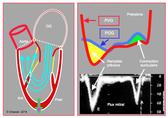 Depuis la valve mitrale, le flux diastolique décrit un large vortex antérieur au niveau de l'apex et vient se placer sous la CCVG; ce tournoiement continu permet de conserver l'énergie cinétique et de limiter le risque de thrombose.