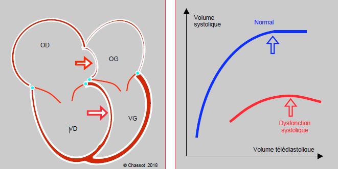 - Au-delà du genou de la courbe, baisse de la performance systolique avec l'augmentation de la précharge ; ce phénomène est dû à la dilatation ventriculaire par surcharge de volume, qui entraîne une décompensation.