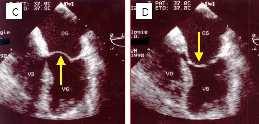 Figure 11.87 : Sténose mitrale (SM) lors de RAA (images ETO). A : vue 4-cavités ; l’OG est gigantesque, le VG est petit ; la fusion commissurale retient les feuillets en diastole et l’ouverture (flèche) est minime. B : fusion commissurale très serrée des deux feuillets. C : le corps du feuillet antérieur, resté souple dans le RAA, bombe dans l’OG en systole. D : le corps du feuillet antérieur bombe dans le VG en diastole (déformation en canne de hockey).