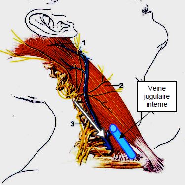 Figure 19.11 : Infiltration du plexus cervical superficiel. Une troisième infiltration est réalisée dans le même plan que l'image précédente en dirigeant l'aiguille vers l'insertion du sterno-cléido-mastoïdien sur la clavicule (flèche). L'aiguille se rapproche à quelques millimètres de la veine jugulaire interne (représentée schématiquement en bleu), qui suit en profondeur le bord antérieur du chef postérieur. Avancer précautionneusement en aspirant à chaque déplacement. 1: apophyse mastoïde. 2: muscle sterno-cléido-mastoïdien. 3: apophyse transverse de C6 [Extrait de: Scott DB. Techniques illustrées d'anesthésie loco-régionale. Paris: Arnette 1989, 74-77].