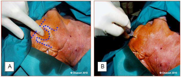Figure 19.13 : Infiltration sous-cutanée. A: Infiltration sous-cutanée de la peau au niveau de l'incision chirurgicale avec 7-8 ml de Bupivacaïne 0.5% sans adrénaline. B: Infiltration sous-cutanée de la région de l'angle mandibulaire.
