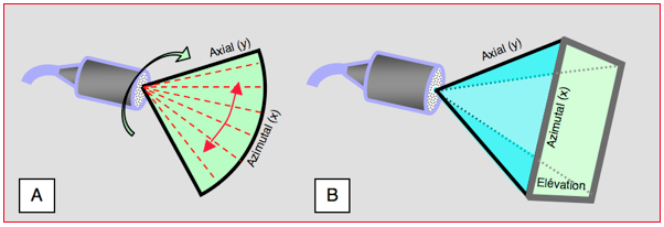 Figure 25.32 : Technologie de l'imagerie bi- et tridimensionnelle. A: le transducteur bidimensionnel émet par balayage électronique (flèche rouge) un plan d'analyse selon deux axes: axial (y) et azimutal (x). B: le capteur tridimensionnel émet un vaste volume pyramidal pour analyser son objet selon trois axes: axial (y), azimutal (x) et élévationnel (z). Dans un système 2D, l'élévation est représentée par l'épaisseur (théoriquement nulle) du plan.