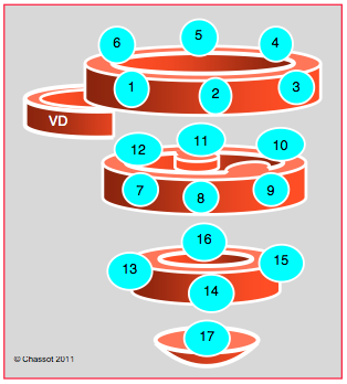 Figure 25.117: Numérotation des 17 segments du VG. La numérotation débute au sillon interventriculaire antérieur à la base du ventricule et tourne dans le sens anti-horaire ; il y a 6 segments au niveau du tiers basal, 6 au niveau du tiers médio-ventriculaire et 4 au tiers apical ; le 17ème segment est la coiffe apicale [4].