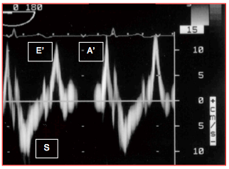 Figure 25.182 : Courbe des vélocités de l'anneau mitral latéral au Doppler tissulaire traduisant la contraction-relaxation longitudinale du VG. S: contraction systolique. E': relaxation protodiastolique. A': contraction auriculaire. Pour les trois mouvements, la Vmax normale est de 10-15 cm/s.