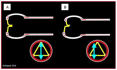 Figure 26.72 : Ouverture de la valve aortique en systole. A : sa forme et sa surface changent au cours de l’éjection. B : dimensions de la valve aortique dans sa forme mésosystolique triangulaire isocèle ; les dimensions affichées sont les longueurs de chacun des côtés. La forme triangulaire est celle adpotée pour la mesure du volume systolique (VS = surface d'ouverture x intégrale des vélocités), parce qu'elle est celle de la valve pendant la majeure partie de la systole [4].