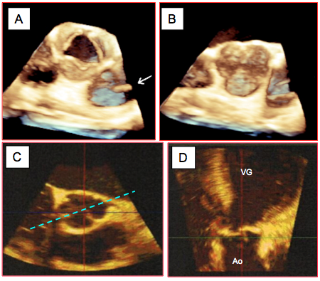 Figure 26.75 : Vues ETO 3D de la valve aortique. A: vue "en-face" depuis la racine de l'aorte en systole; cette vue correspond au court-axe 40°. B : même vue en diastole. La flèche indique la présence d'un cathéter pulmonaire dans l'AP. C : court-axe de l’anneau aortique (plan transverse); le traitillé indique le plan de coupe coronal. D : long-axe de l’anneau (plan coronal) ; ce plan n’est pas réalisable en ETO 2D.