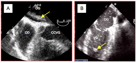 Figure 27.80 : Exemples de thrombi découverts fortuitement dans le postopératoire. A: thrombus flottant dans l'OG après une transplantation pulmonaire; il est fixé à l'anastomose des veines pulmonaires avec l'OG et mesure 4 cm de long. B: thrombus libre dans le VG en sortie de CEC après un remplacement valvulaire aortique; il danse au milieu de quelques microbulles résiduelles. Ces deux exemples sont une indication à un retour en pompe immédiat pour extraction chirurgicale.