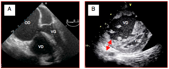 Figure 27.82 : Défaillance droite sur embolie pulmonaire. A: embolie pulmonaire aiguë; le VD et l'OD sont dilatés et empiètent sur les cavités gauches. B: dilatation et hypertrophie massive du VD sur hypertension pulmonaire due à des embolies récédivantes; la paroi du VD mesure 1.8 cm d'épaisseur (vue court-axe transgastrique).