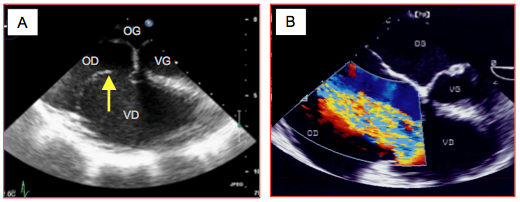 Figure 27.206 : Insuffisance tricuspidienne massive par rupture traumatique de cordage de la valve, avec dilatation de l'OD et du VD. A : bascule du feuillet antérieur (flèche) entraîné par la rupture de cordage. B : insuffisance tricuspidienne massive au Doppler couleur (IT).
