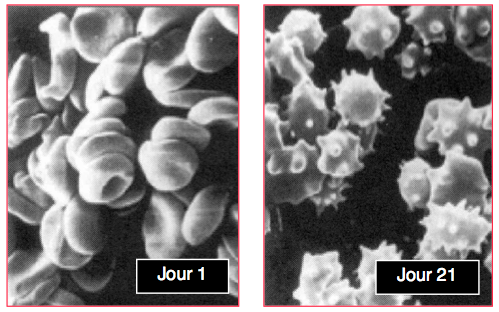 La conservation des poches de sang (28 à 42 jours) s'accompagne d'une cascade de phénomènes qui modifient considérablement l'efficacité de la transfusion, et dont l’impact est directement lié à la durée de conservation.