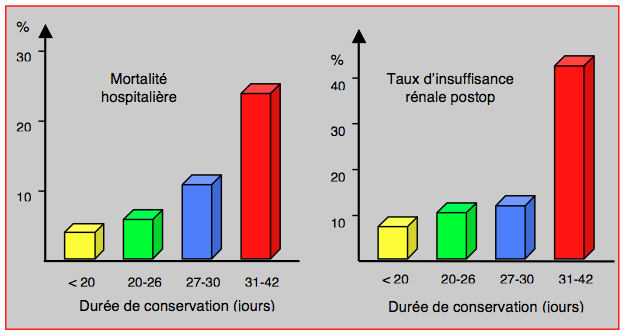 Ces altérations liées à l'âge des poches transfusées ont un impact significatif en clinique. Elles sont un facteur de risque indépendant de morbidité et de mortalité postopératoires lorsque l'on compare des groupes appariées de malades transfusés ou non. Dans une série de 321 patients polytransfusés parce que subissant des opérations cardiaques itératives, l'âge des conserves de sang s'est avéré être directement lié à la mortalité à court et à long terme, à l'incidence de dysfonction rénale et à la durée de séjour hospitalier (Figure 28.3) [1].